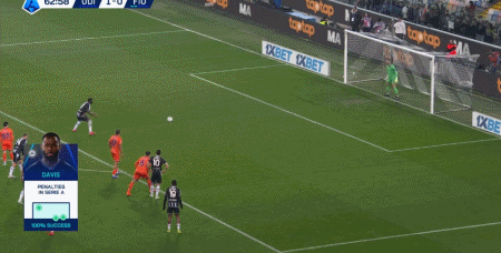 第63分钟,凯南-戴维斯造点,亲自操刀主罚命中,乌迪内斯2-0佛罗伦萨